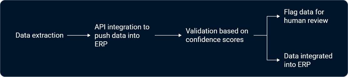 - Automated PO matching and ERP integration: The extracted data is mapped directly to general ledger (GL) codes and pushed into the ERP system via API integration. If there are purchase order coding discrepancies, the system flags them for immediate review.