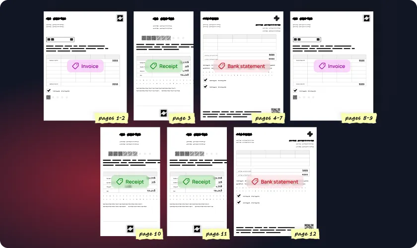 When a vendor submits a 50-page PDF containing a consolidated batch of daily mixed mail, you require a specialized mechanism to process multi-page files. You can implement the Split tool from Mindee. The AI detects where each individual document begins and ends, automatically splitting the large file into logical, separate documents. Once separated, the system functions as an intelligent routing engine. By utilizing the Classify tool, the system analyzes incoming files and automatically categorizes them by type, identifying whether a file is a contract, an invoice, or a pay slip. Routing these to the correct extraction pipeline using computer vision and a template-free approach drastically reduces error rates compared to legacy methods.