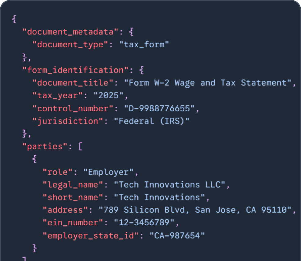 Our NLP-driven engine redefines fiscal processing by instantly mapping taxpayer details, tax years, gross income, and tax withholdings into validated JSON. Built for high-stakes compliance, it bridges the gap between static PDF tax forms and your digital ERP, tax software, or risk management database. Accelerate your audits and stop manual sorting with high-precision, machine-readable output.