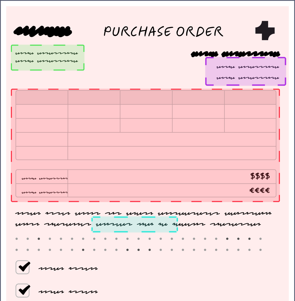 Mindee OCR API extracts structured purchase order data that adapts to any layout and vendor formats. Capture vendor name, shipping address, item descriptions, unit prices, total amount... from scanned images and PDFs.